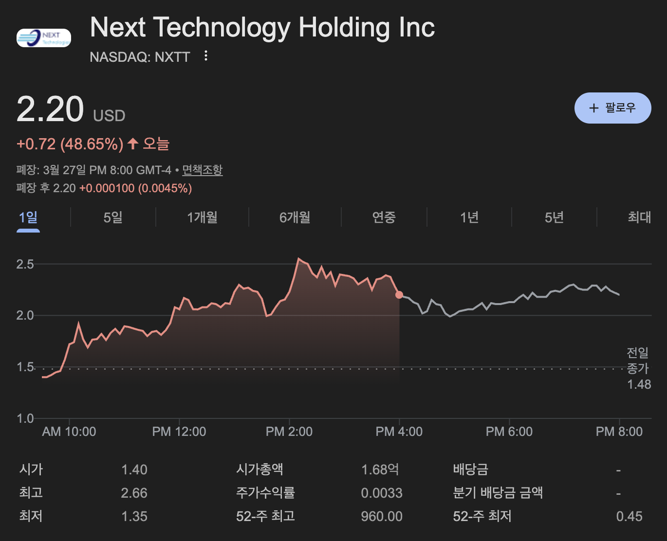 안녕하세요, 경제 및 투자 전략 전문 블로그 Quantum Asset입니다.한국 시간 3월 30일 월요일 아침입니다. 지난 주말 뉴욕 증시가 전반적으로 조정 장세에 진입하며 나스닥이 교정 구역에 들어선 가운데, 디지털 자산과 AI 테마를 동시에 보유한 한 소형주가 압도적인 거래량과 함께 다시 한번 수직 상승했습니다. 바로 **넥스트 테크놀로지 홀딩(Next Technology Holding Inc., Ticker: NXTT)**입니다. 지난 금요일(27일) 1.48달러에서 시작한 주가는 장중 한때 2.66달러까지 치솟았으며, 결국 전일 대비 +48.65% 상승한 2.20달러에 마감했습니다. 이번 추가 폭등의 배경과 실질적인 기업 가치를 정밀 분석해 드립니다. 🚀 📉 오늘의 주요 지표 한눈에 보기항목..