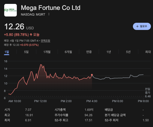 안녕하세요, 경제 및 투자 전략 전문 블로그 Quantum Asset입니다.한국 시간 4월 2일 목요일입니다. 어제 나스닥이 3.8% 폭등하며 기술주 장세가 펼쳐진 가운데, 그 기세를 이어받아 기록적인 수직 상승을 보여준 종목이 있습니다. 홍콩 기반의 IoT(사물인터넷) 솔루션 전문 기업인 **메가포춘(Mega Fortune Company Limited, Ticker: MGRT)**이 그 주인공입니다. 전일 대비 **+89.78%**라는 경이로운 상승률을 기록하며 12.26달러에 마감한 MGRT의 급등 배경과 기업 분석, 그리고 향후 전망을 정밀 분석해 드립니다. 🚀 📉 오늘의 주요 지표 한눈에 보기항목상세 내용종목명 / 티커메가포춘 (Mega Fortune) / MGRT마감 주가12.26달러 (전..